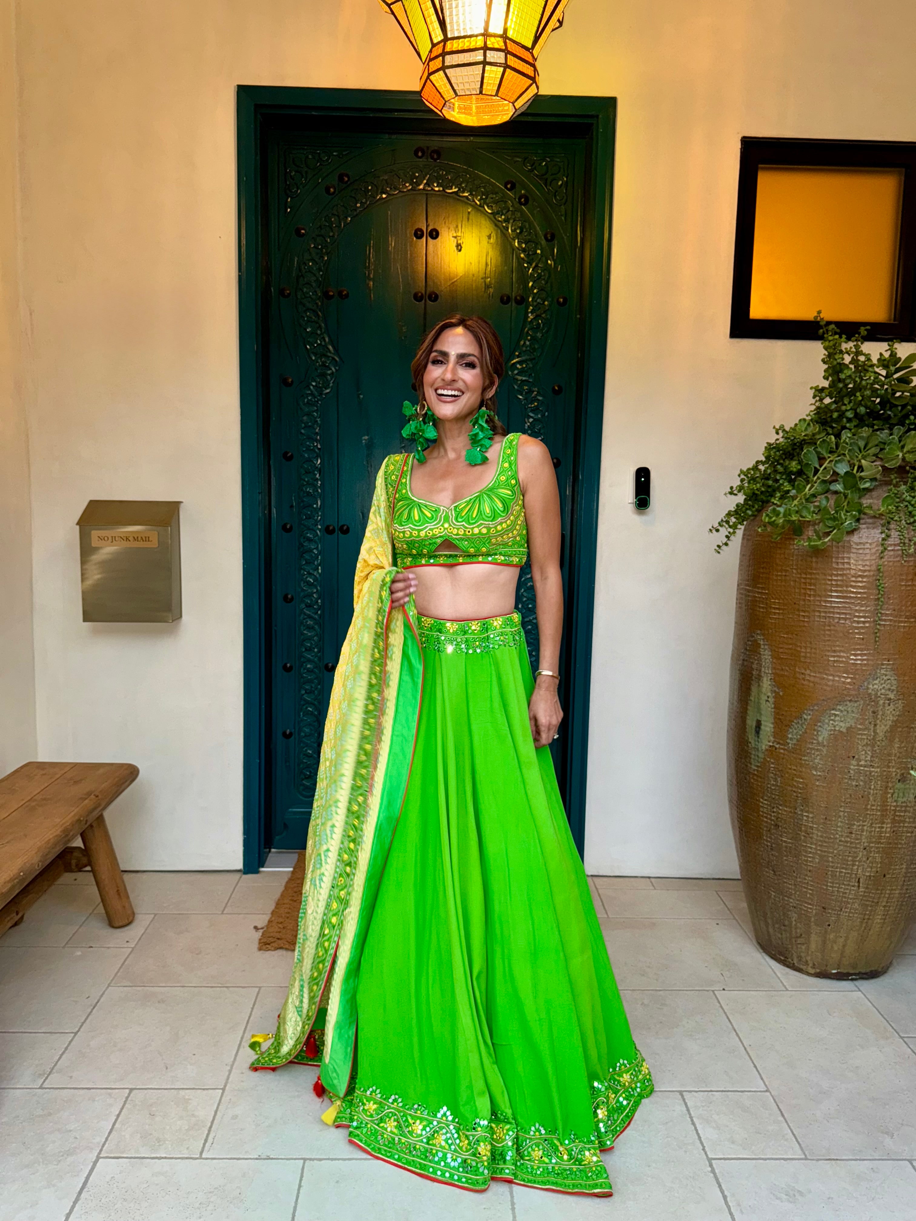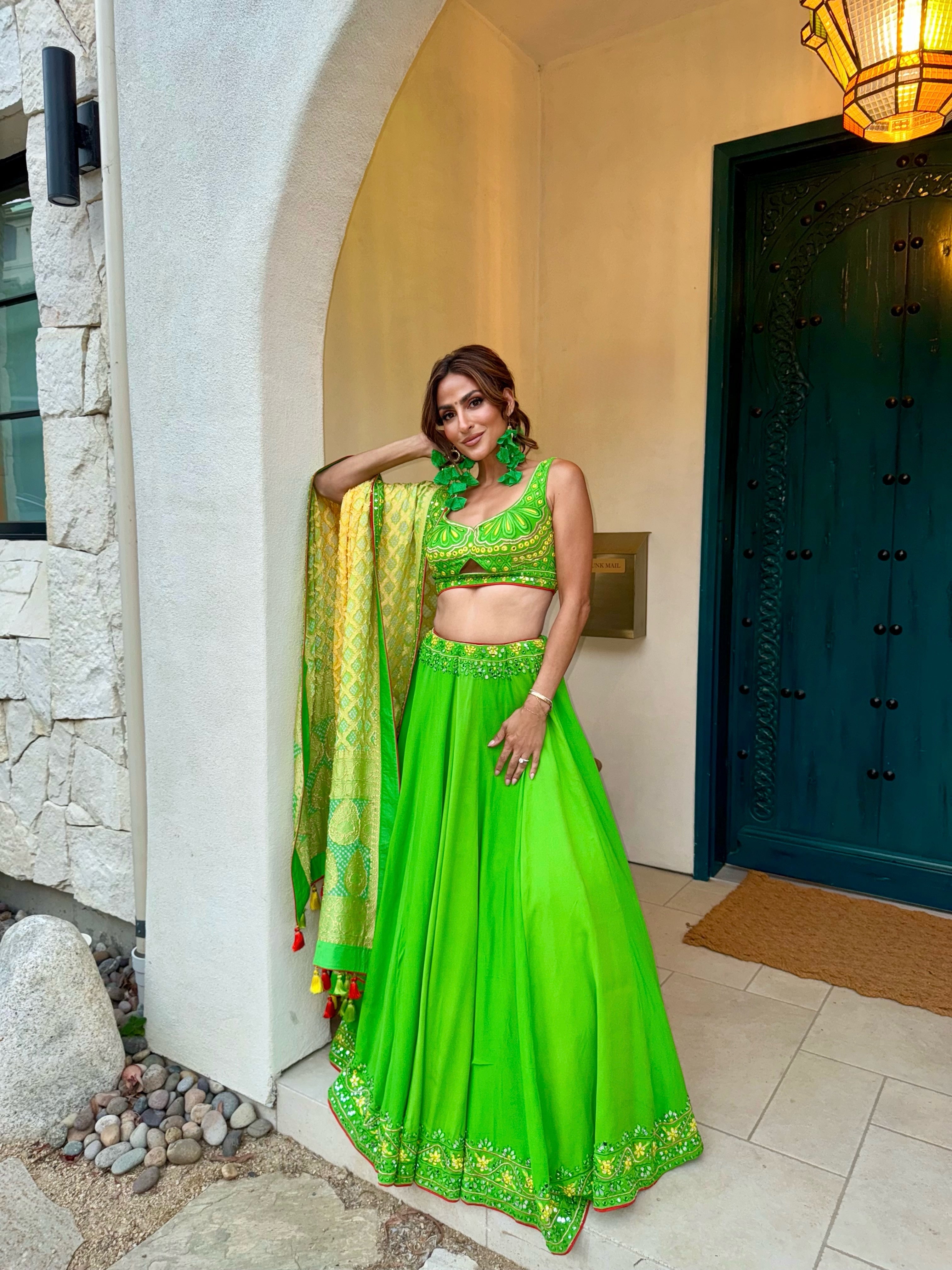 Hand embroidered lengha, with a two tone bandej dupatta.