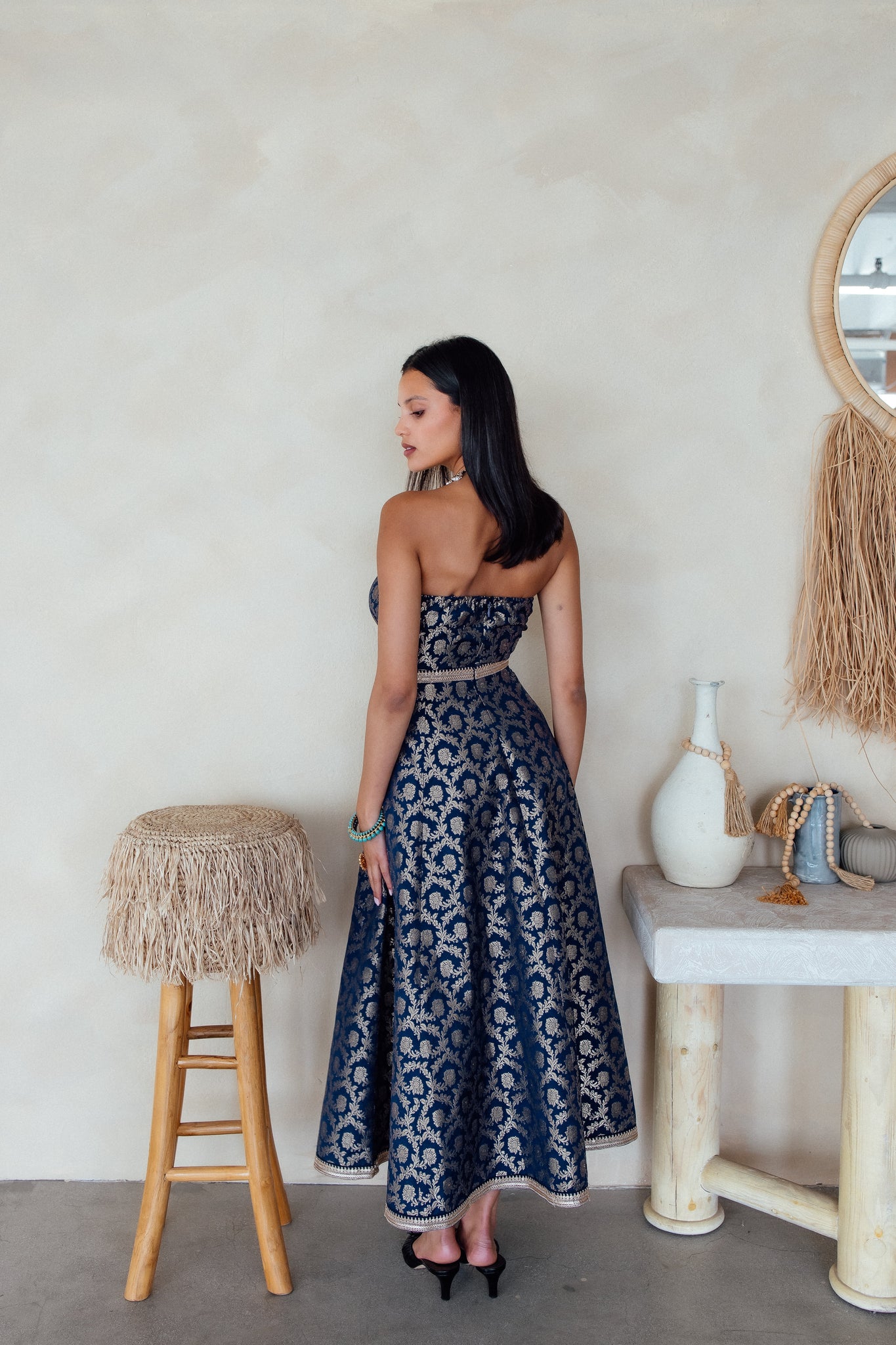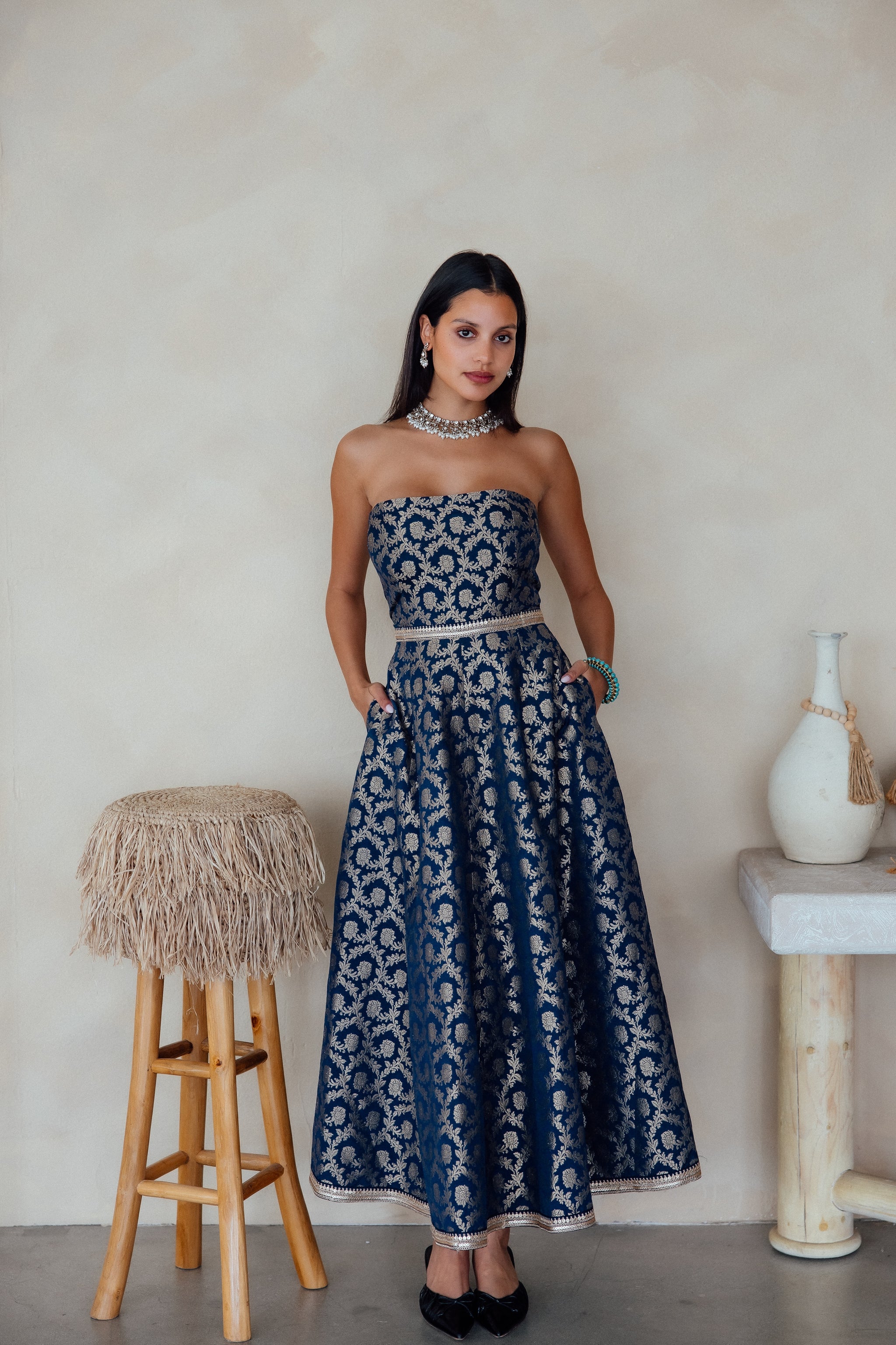 A chic blue brocade dress featuring practical pockets and removable straps for versatile styling.